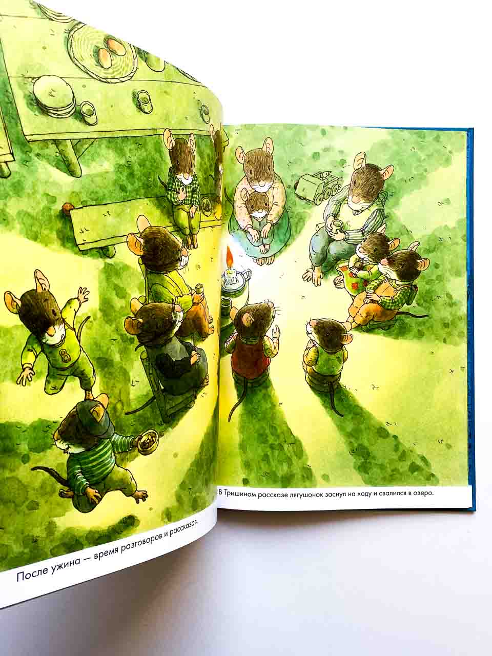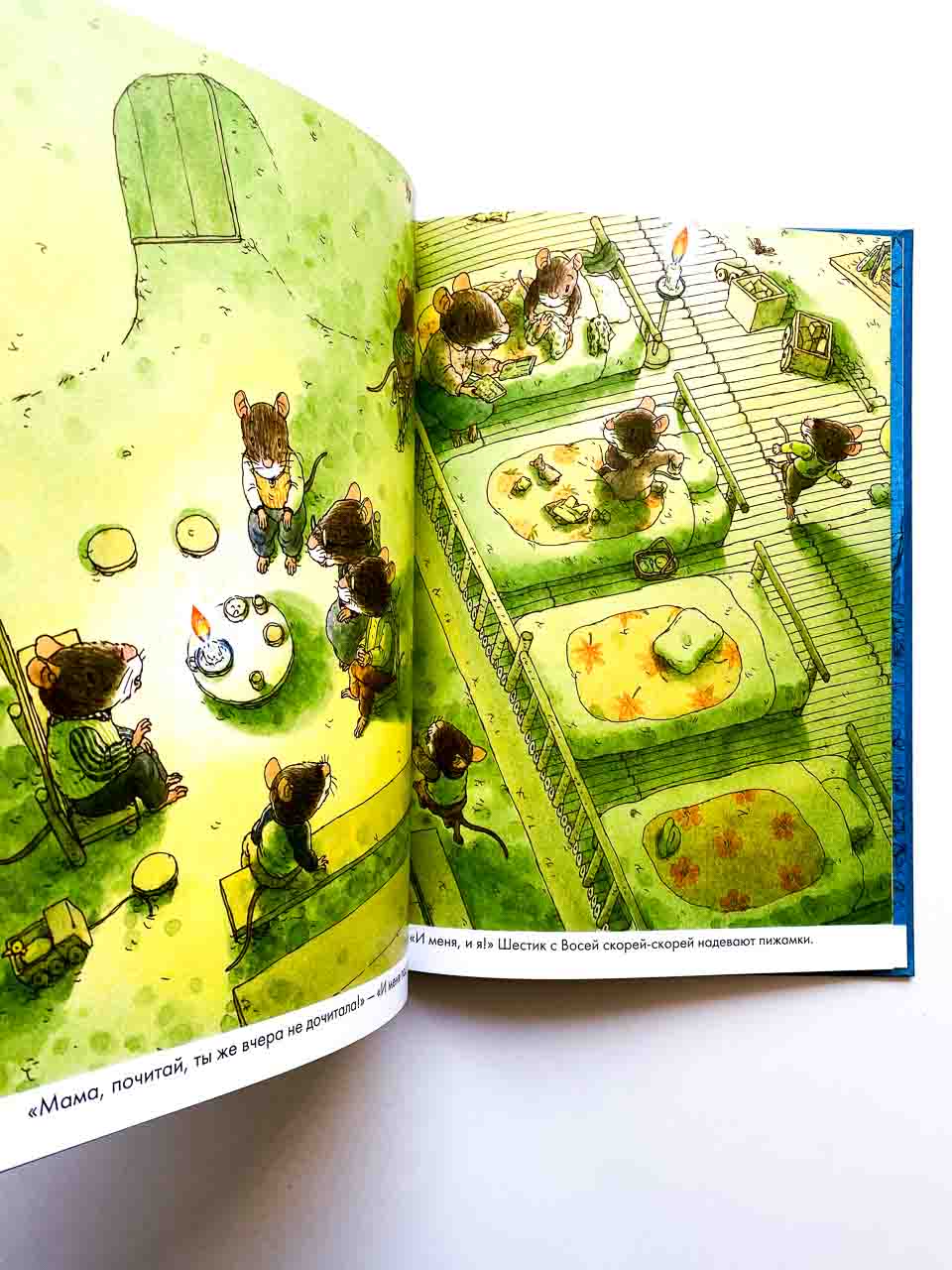 “14 лесных мышей. Колыбельная” – об окончании длинного и полного событий дня и нежных и важных вечерних ритуалах. Теплая японская баня с купаниями и играми, уютный ужин, истории, которые мышата рассказывают друг другу по очереди. И, конечно, вечерняя мамина сказка и бабушкина колыбельная: укладываться спать с мышиным семейством – настоящее удовольствие!