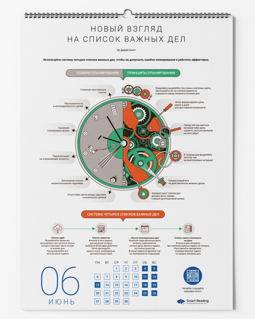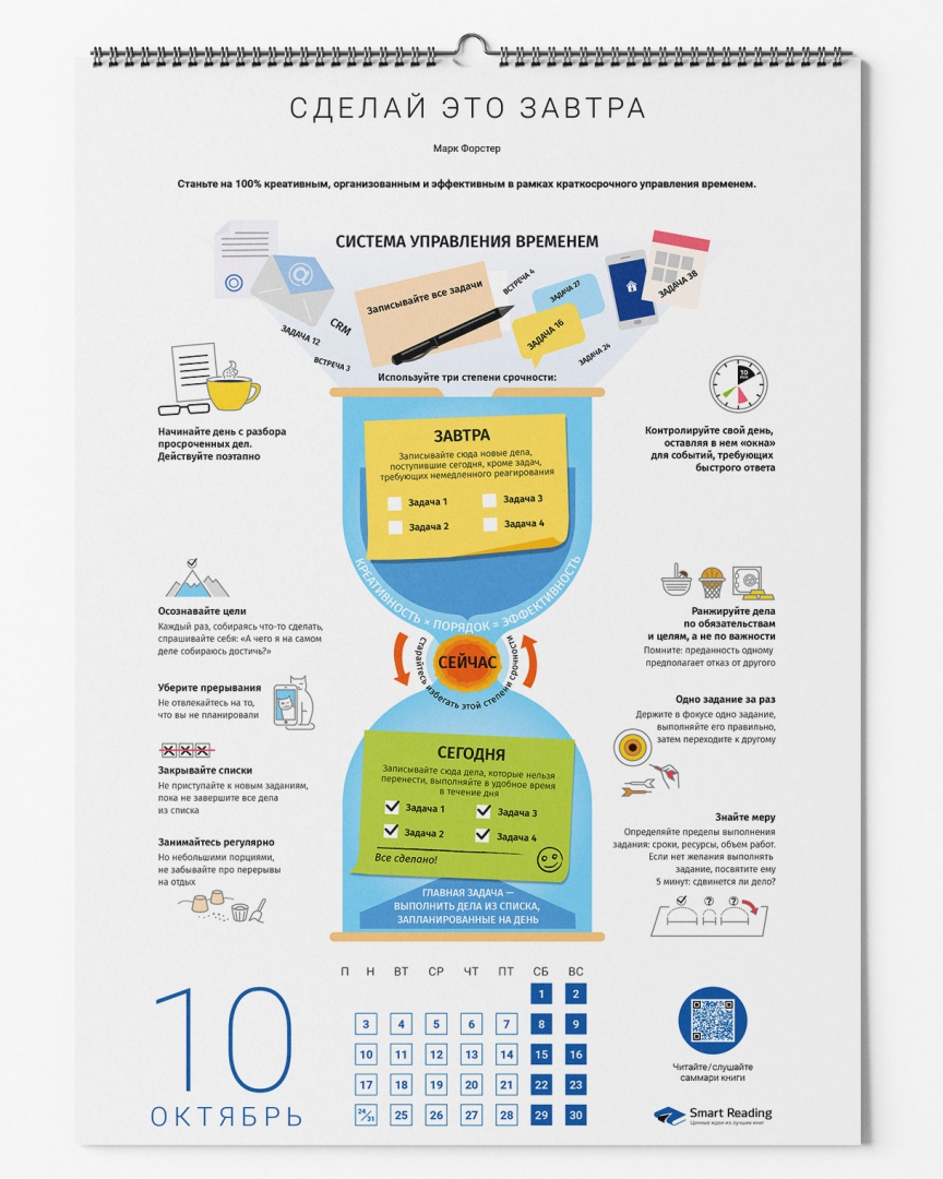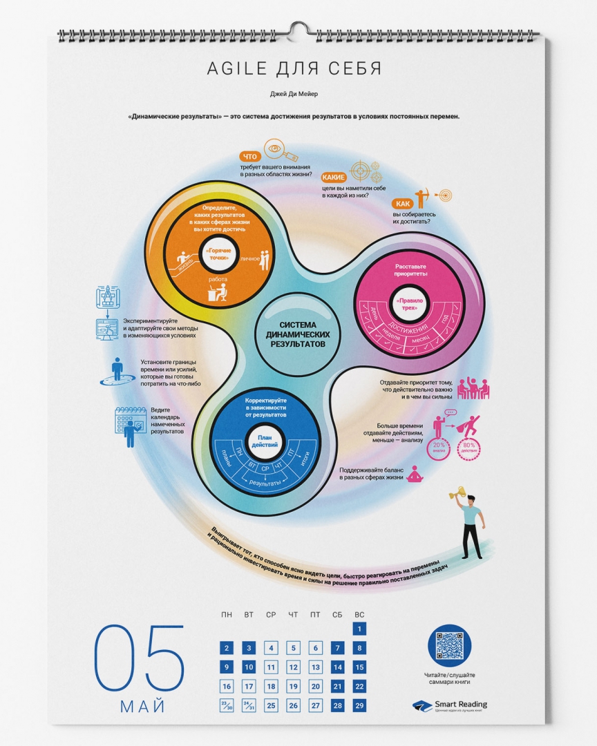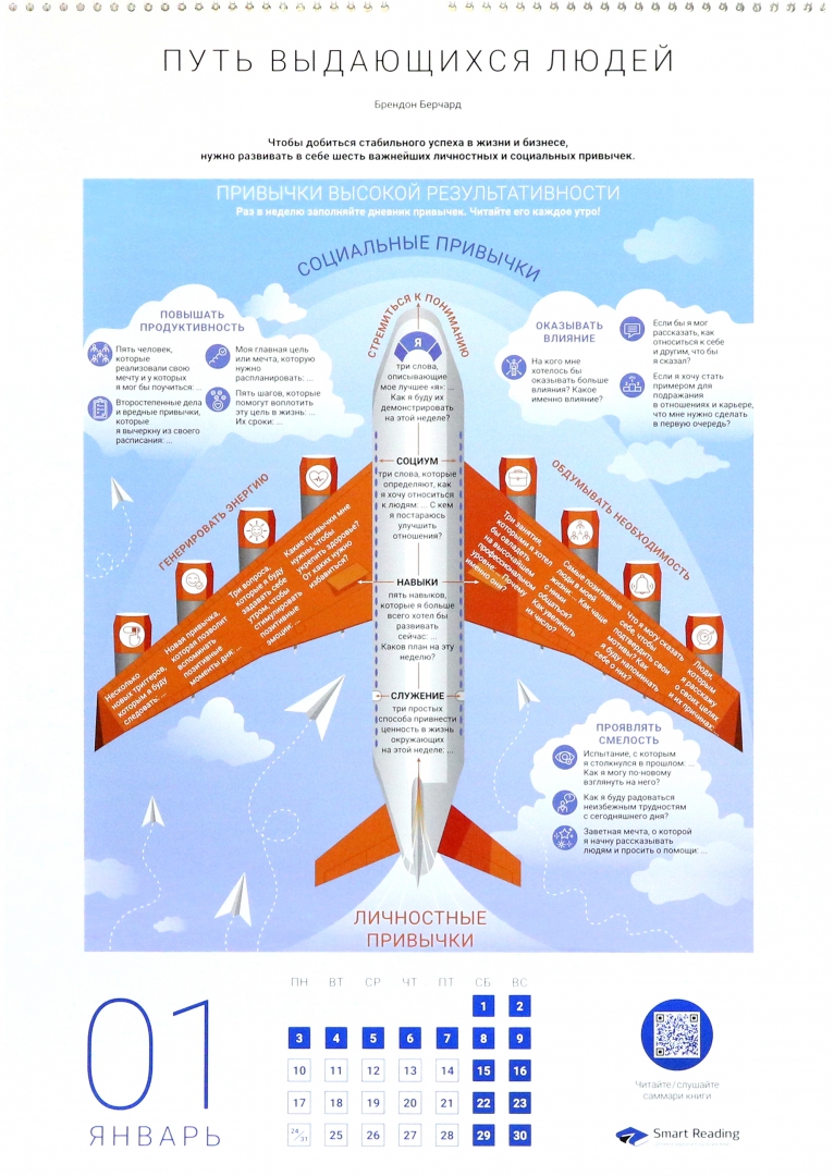 Перед вами — наглядный практический инструмент, с которым удобно взаимодействовать на протяжении всего года. Каждый из 12 месяцев представлен инфографикой, составленной по отдельному бизнес-бестселлеру. Среди ваших «тренеров» будут такие авторитетные авторы, как Брендон Берчард, Мел Роббинс, Петр Людвиг, Марк Форстер и другие.