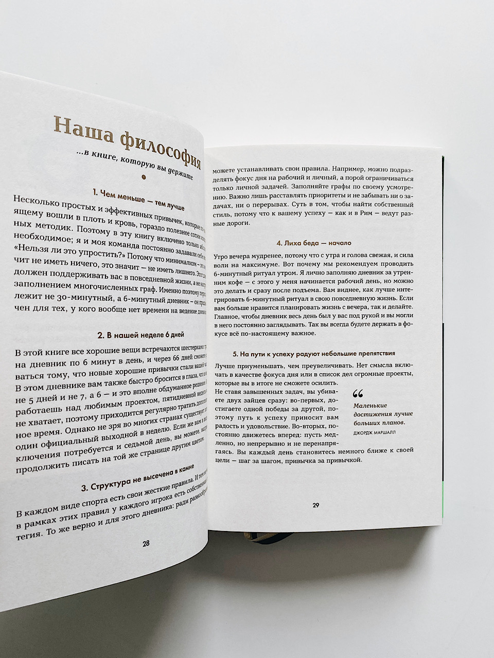Концепция дневника основана на данных научных исследований и практических методах. В сочетании с проверенным 6-минутным принципом вы будете гарантированно двигаться к цели за шагом, привычка за привычкой – последовательно и с результатом в долгосрочной перспективе.