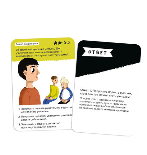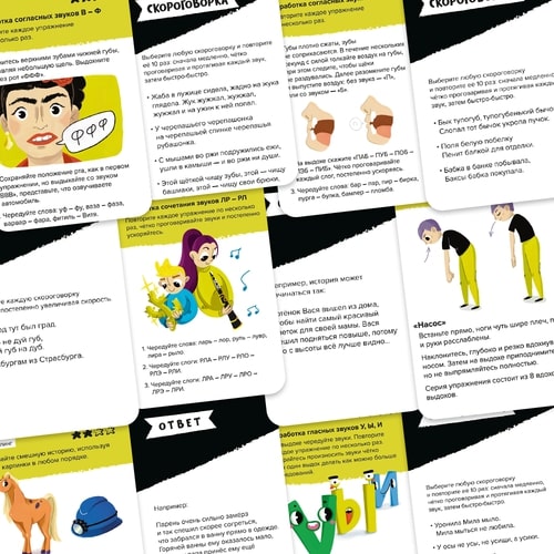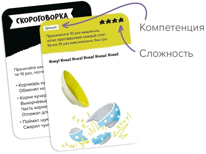 В наборе 80 обучающих карточек: 60 карт с заданиями и 20 карт с упражнениями на постановку речи.У каждого задания указан уровень сложности и основная компетенция, которую развивает данный тип задач. На обороте карты — ответ с пояснением решения.