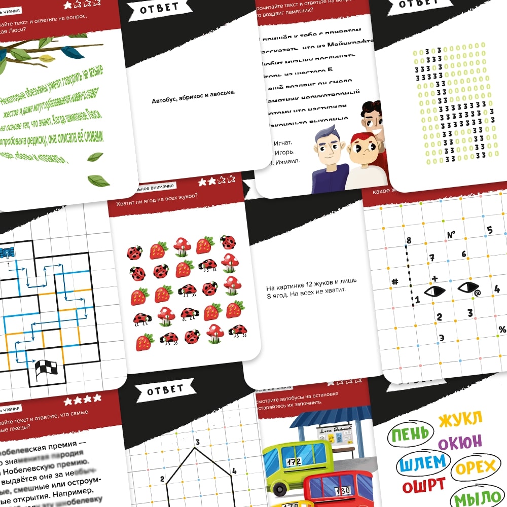 В наборе 80 обучающих карточек с заданиями. У каждого задания указан уровень сложности и основная компетенция, которую развивает данный тип задач. На обороте некоторых карт размещены ответы или проверочные вопросы. Не спешите заглядывать в них, постарайтесь выполнять задание без подсказки 🙂