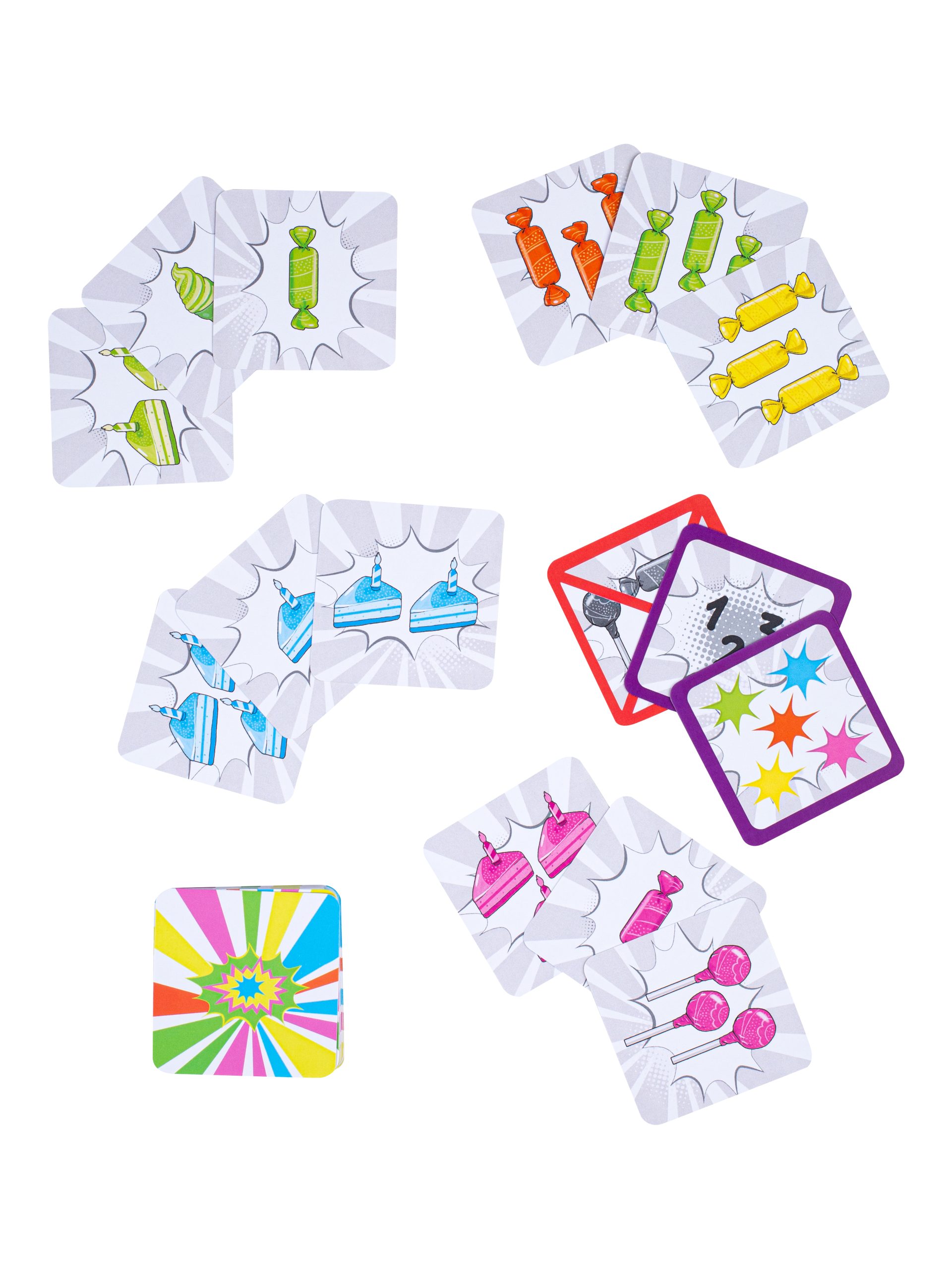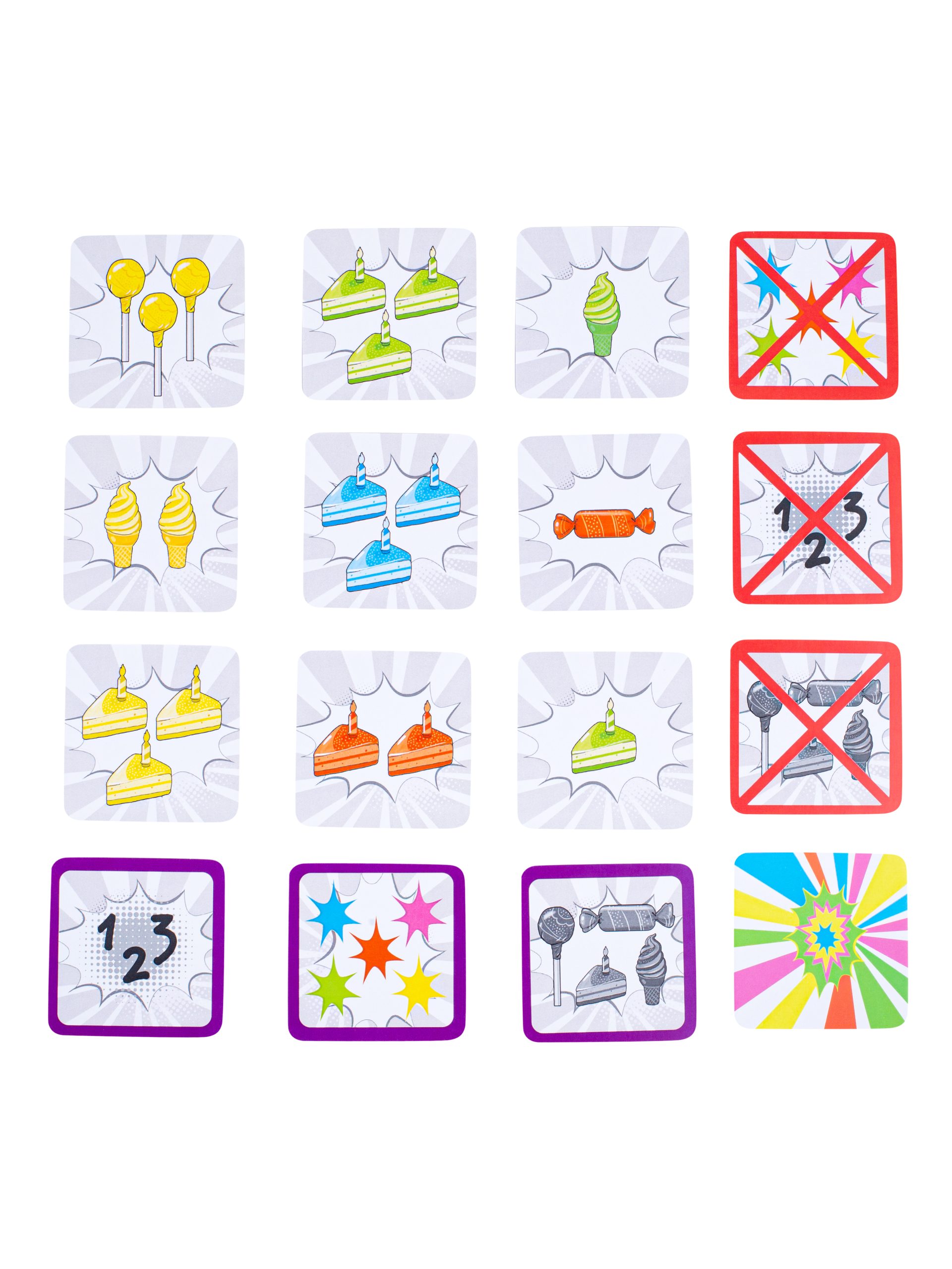 Следи за количеством, цветом и видом сладостей. Называй общее свойство, как только увидишь совпадение на 3 картах – забирай вкусняшки в победную кучу!