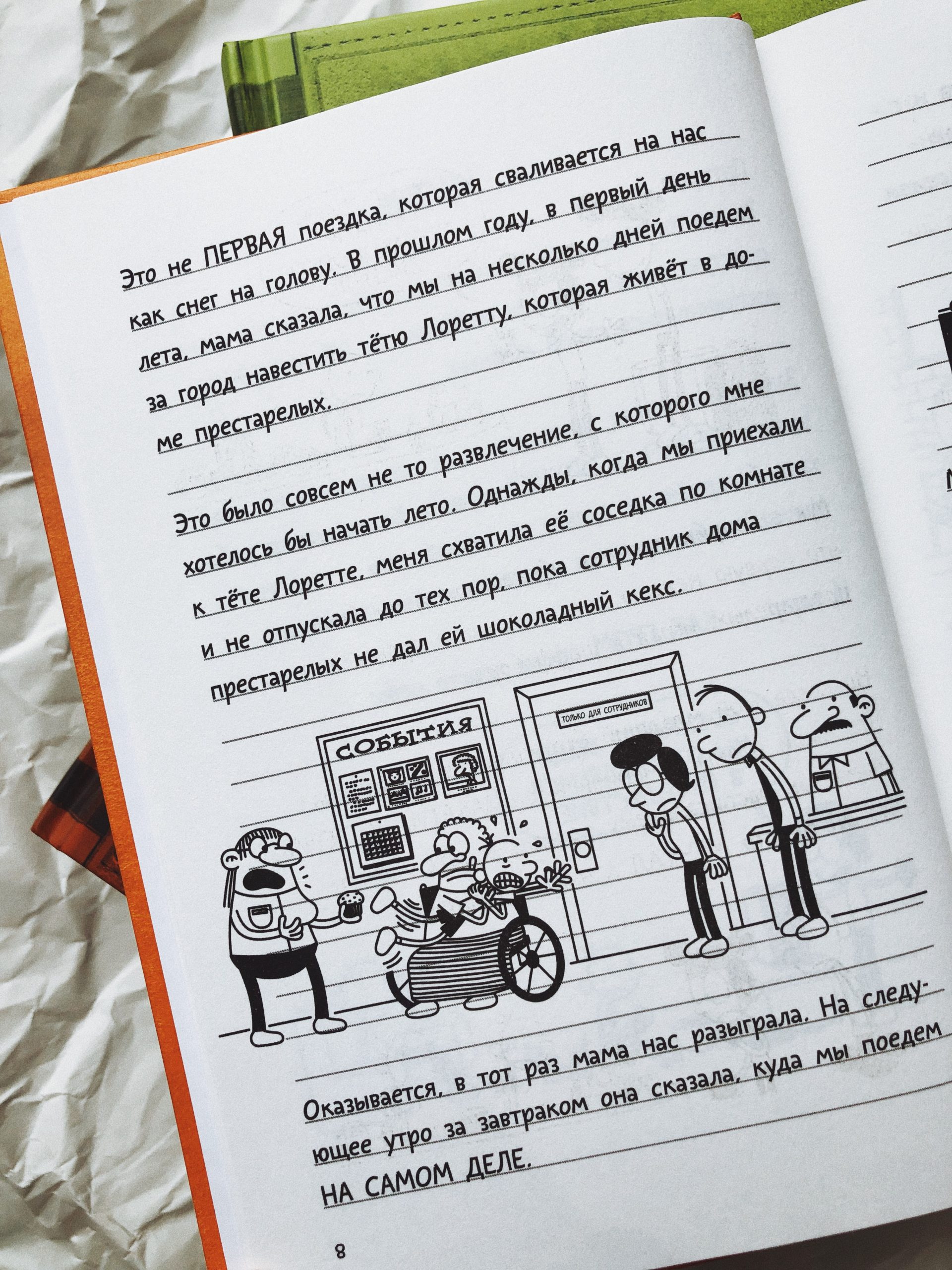 Путешествовать с семьёй обычно очень весело… если, конечно, вы не из семейки Хэффли. Поездка на автомобиле для Грега, его родителей и братьев оборачивается чередой неприятностей: то они сталкиваются со стайкой бешеных чаек; то поросёнок сбежит, то свернут не туда… Про ужасные туалеты на заправочных станциях и говорить нечего – это же настоящий кошмар! Но любая долгая дорога сулит приключения – и для Грега они станут незабываемыми.
