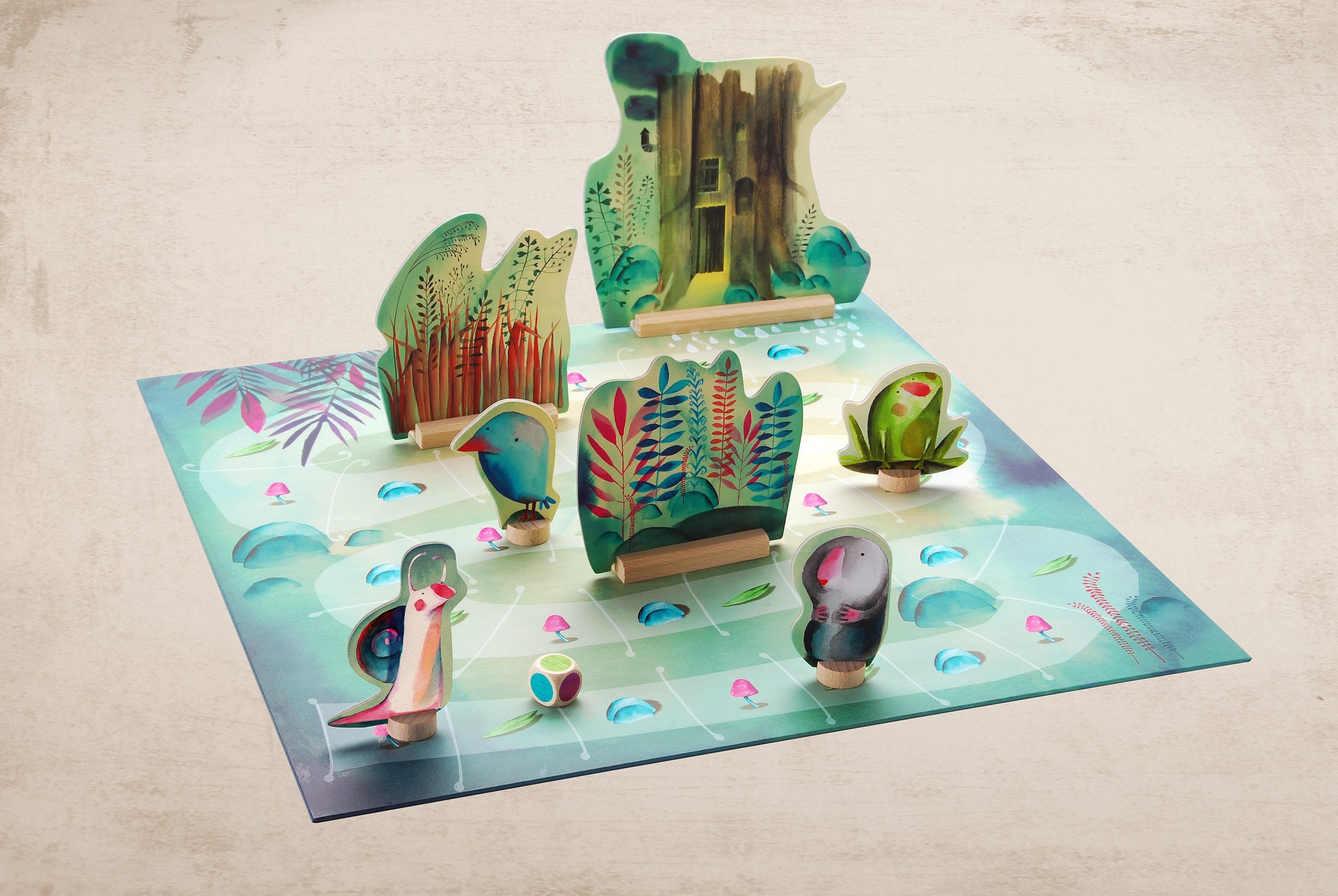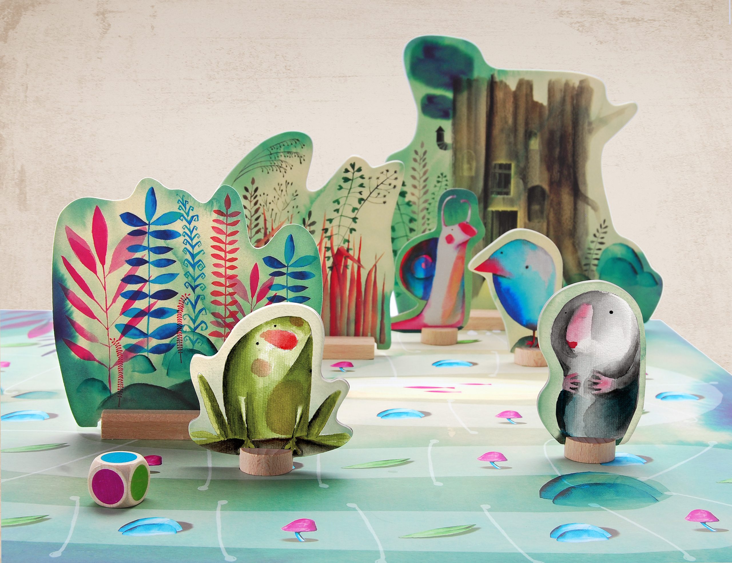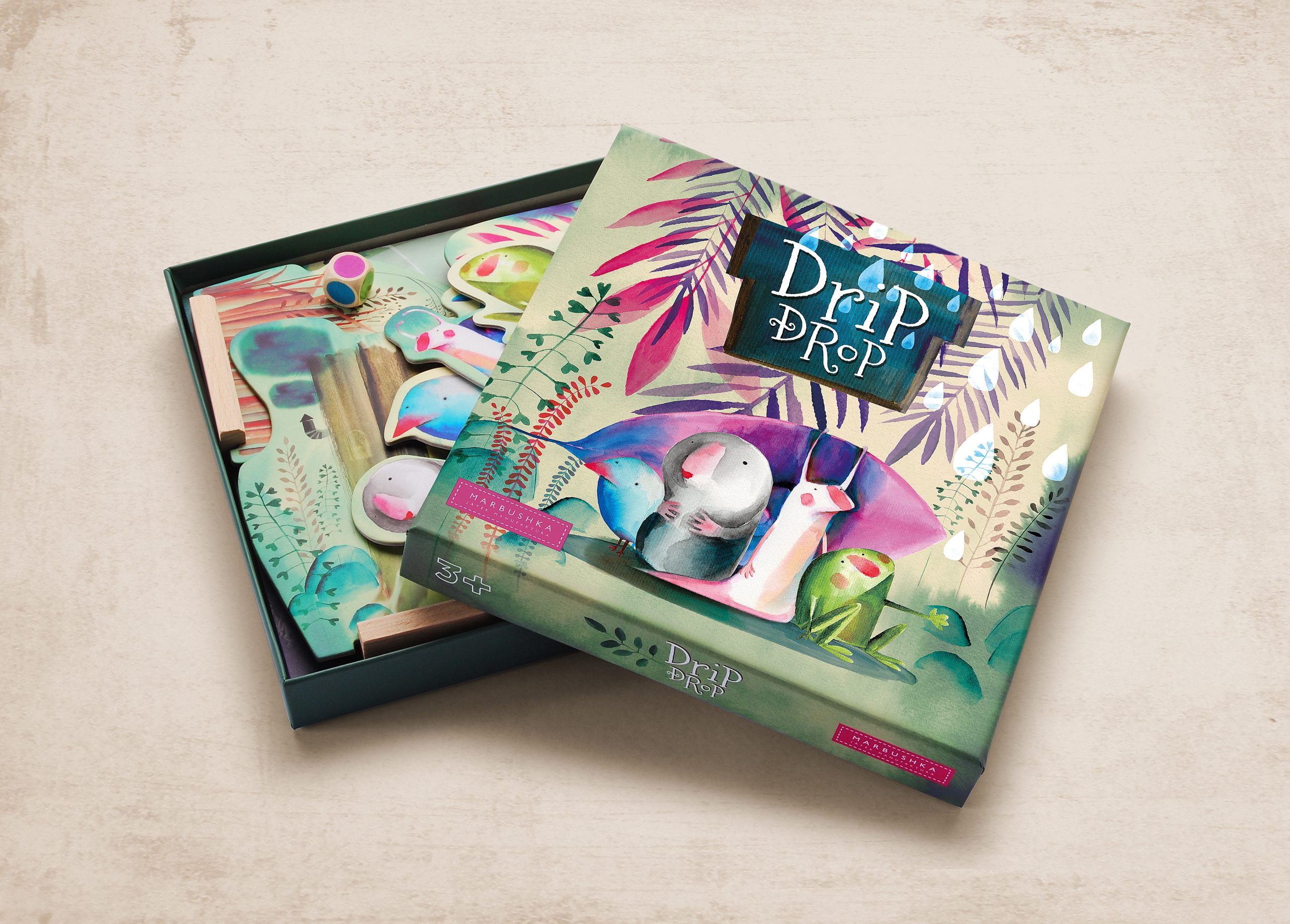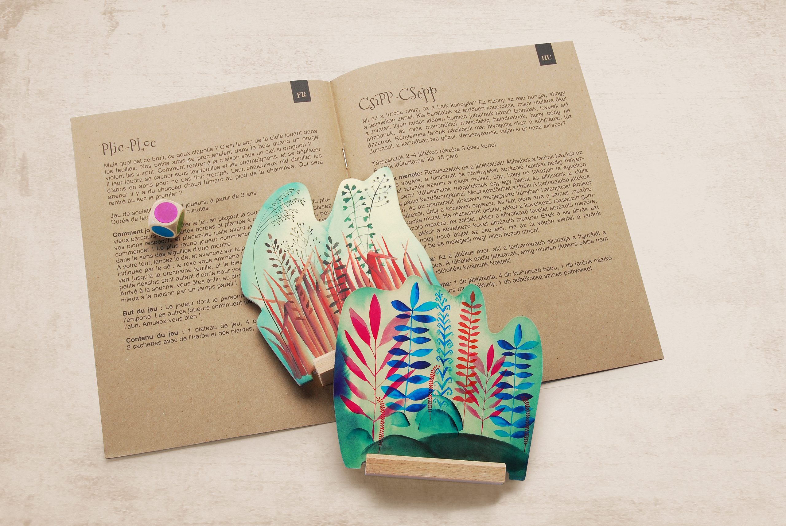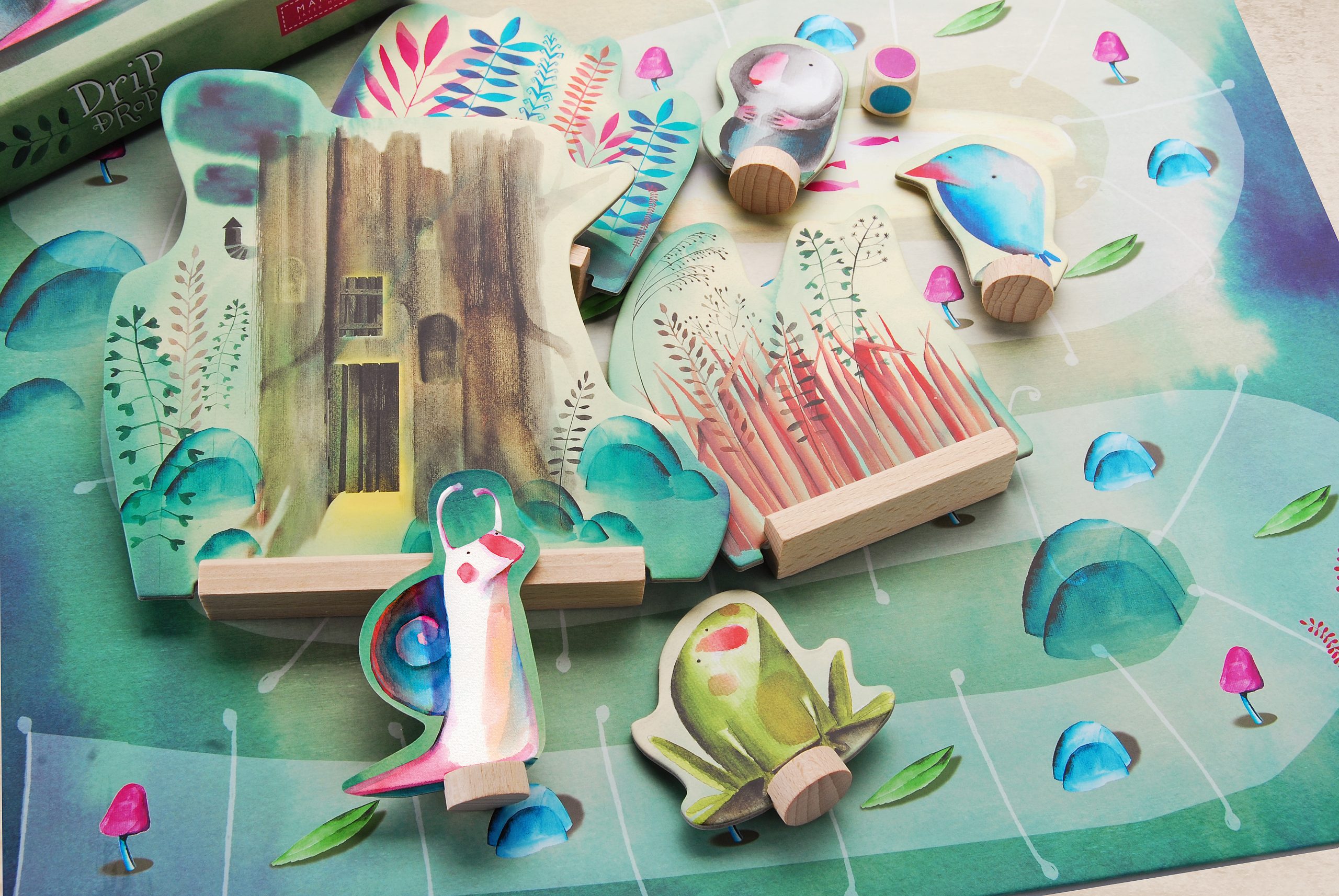 Кап… Кап… Кап… Что за странный звук за окном, что за тихий перестук? Ах, это капли дождя барабанят по листьям! Наши маленькие друзья блуждали по лесу, и тут буря застигла их. Как же им добраться домой в такую непогоду? Они прячутся под грибами и листьями и могут только перебегать от укрытия до укрытия, чтобы не промокнуть. Их ждёт уютный домик на дереве — там в камине потрескивает огонь, а чайник уже закипает. Малыши мчатся наперегонки, кто же доберётся домой первым?