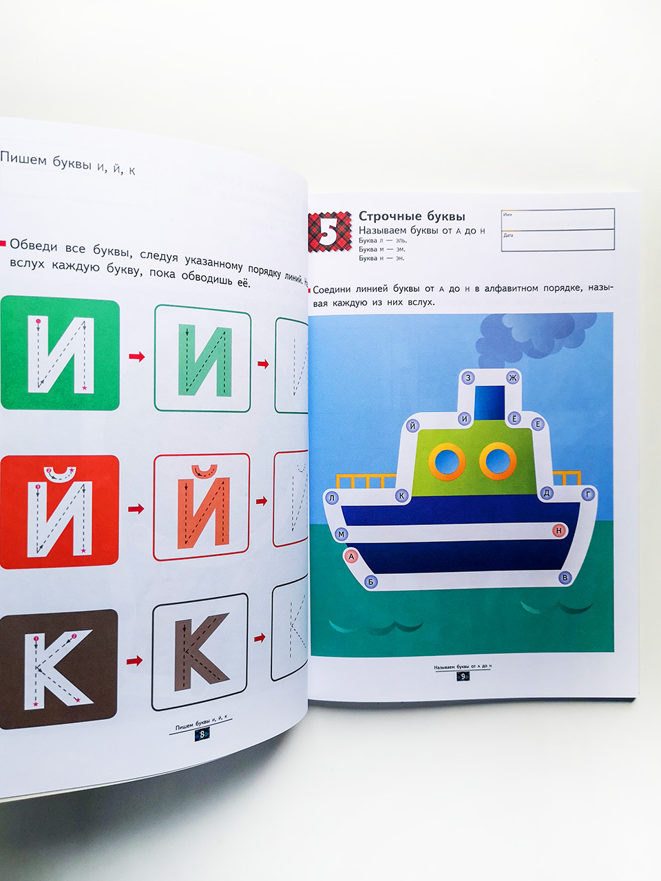 Заглавные буквы (№ 13-23): в упражнениях этого раздела ребенок проводит линии, соединяя между собой заглавные буквы в алфавитном порядке. Когда задание будет выполнено, малыш получит забавную картинку. Во второй части заданий ребенок также обводит буквы, называя их вслух.