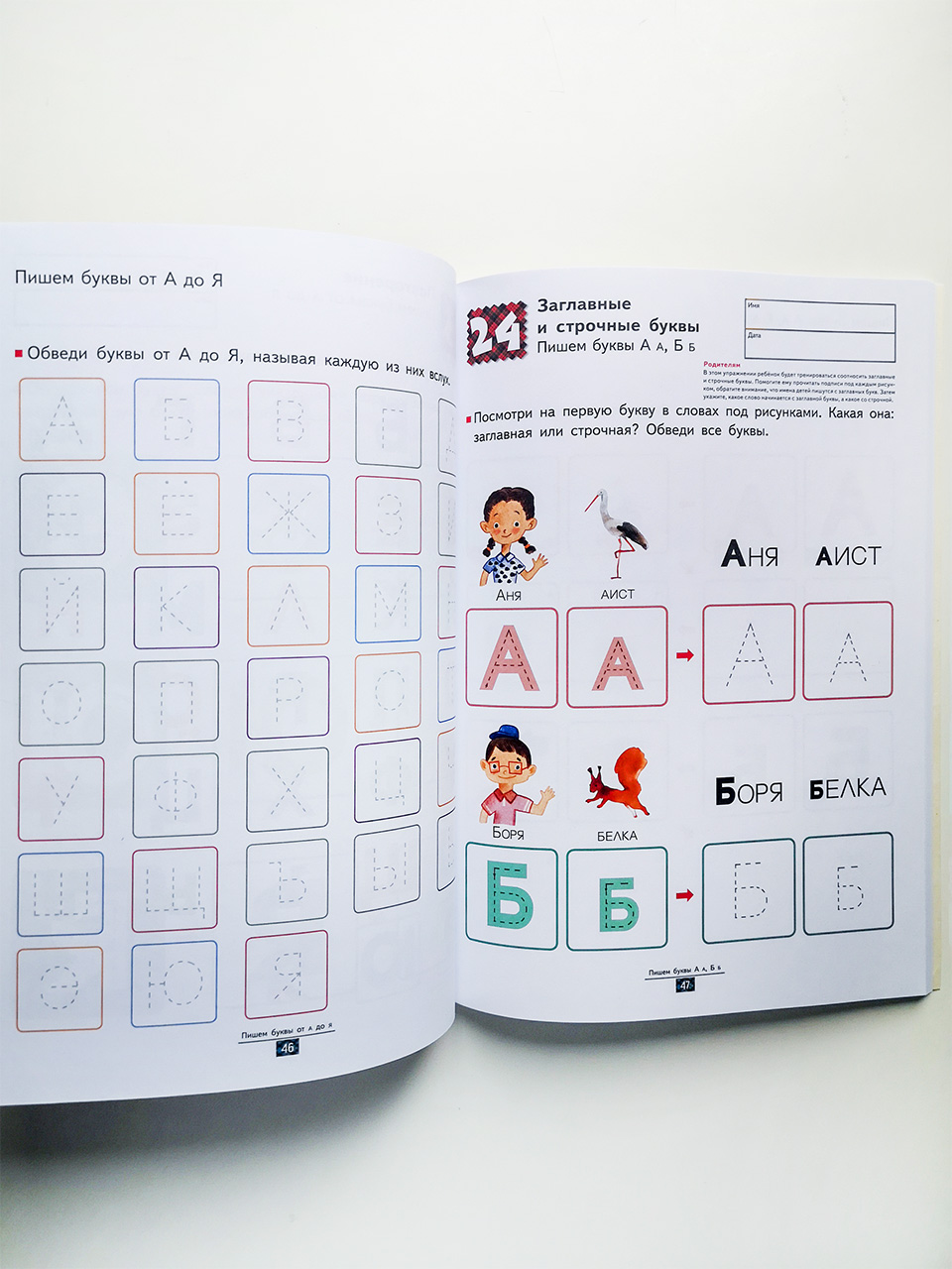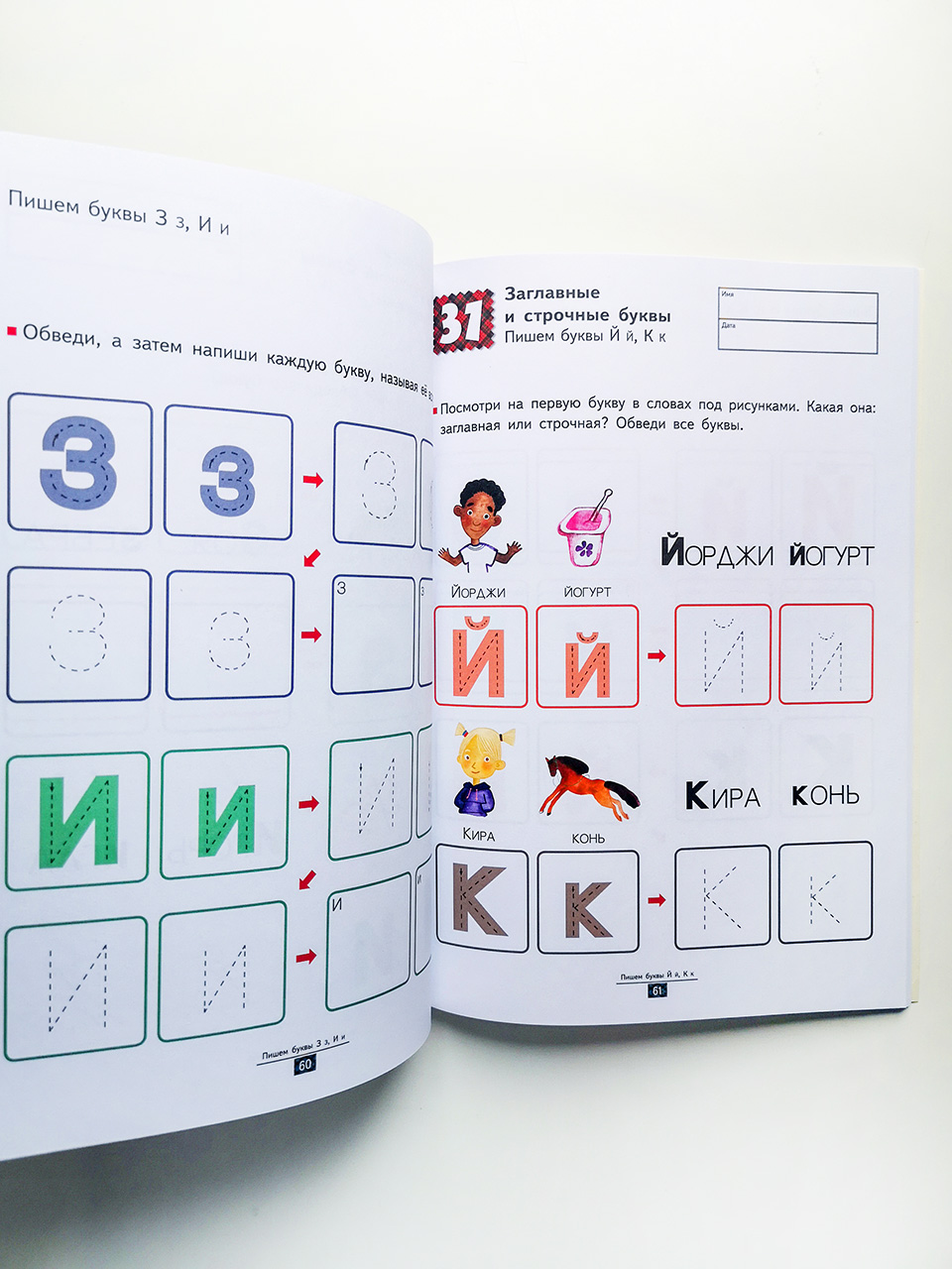 Заглавные и строчные буквы (№ 24-50): в этом разделе ребенок будет одновременно обводить и заглавные, и строчные буквы. Кроме того, на одной странице он увидит слова, которые начинаются с заглавной и со строчной буквы. Малышу предлагается придумать простое предложение из этих слов.
