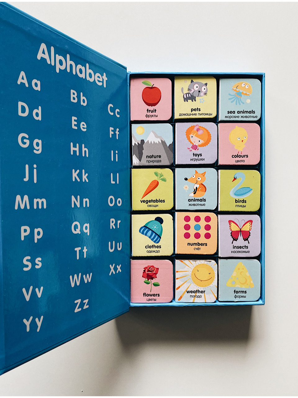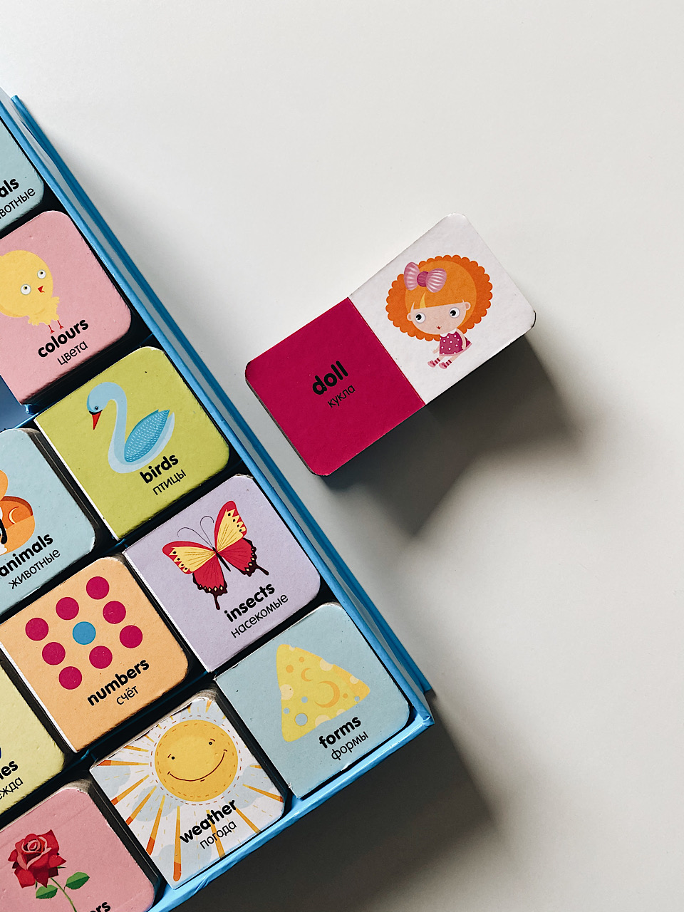 Одежда, цвета, животные, фрукты и многое другое — все базовые темы для развития интеллекта и речевого навыка малыша, теперь в одной коробке.