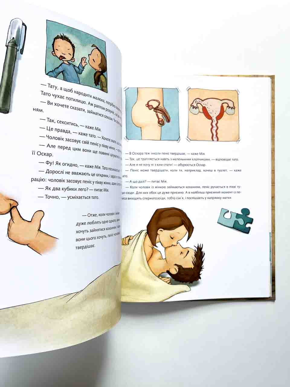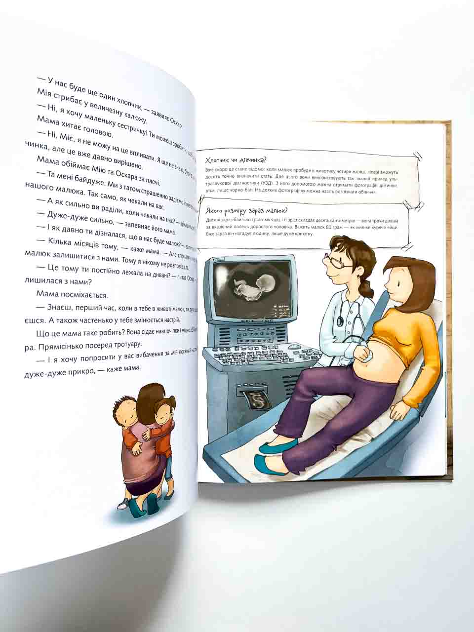 В Оскара та Мії скоро з’явиться братик чи сестричка. І це страшенно цікаво! Як малюк взагалі опиняється в маминому животику? Чи падає йому на голову їжа, коли мама обідає? Чим відрізняються хлопчики від дівчаток? На всі ці дитячі запитання книга має делікатні пояснення з цікавими розповідями та картинками. Наприкінці книги, дізнавшись багато нового, Мія та Оскар радіють народженню маленького братика.