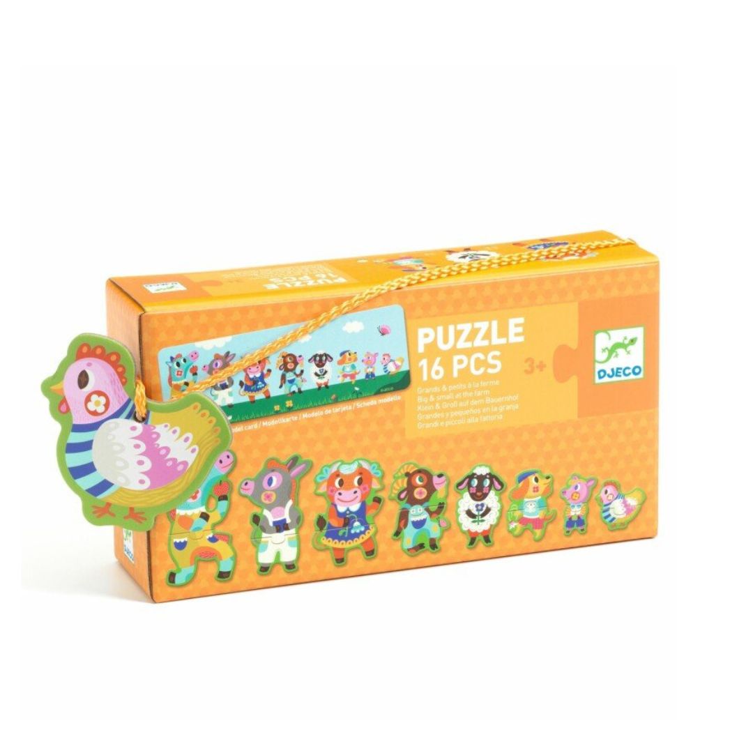 Пазл состоит из 8 животных. Соберите каждого из них, соединив 2 детали, а затем составьте животных по размеру.