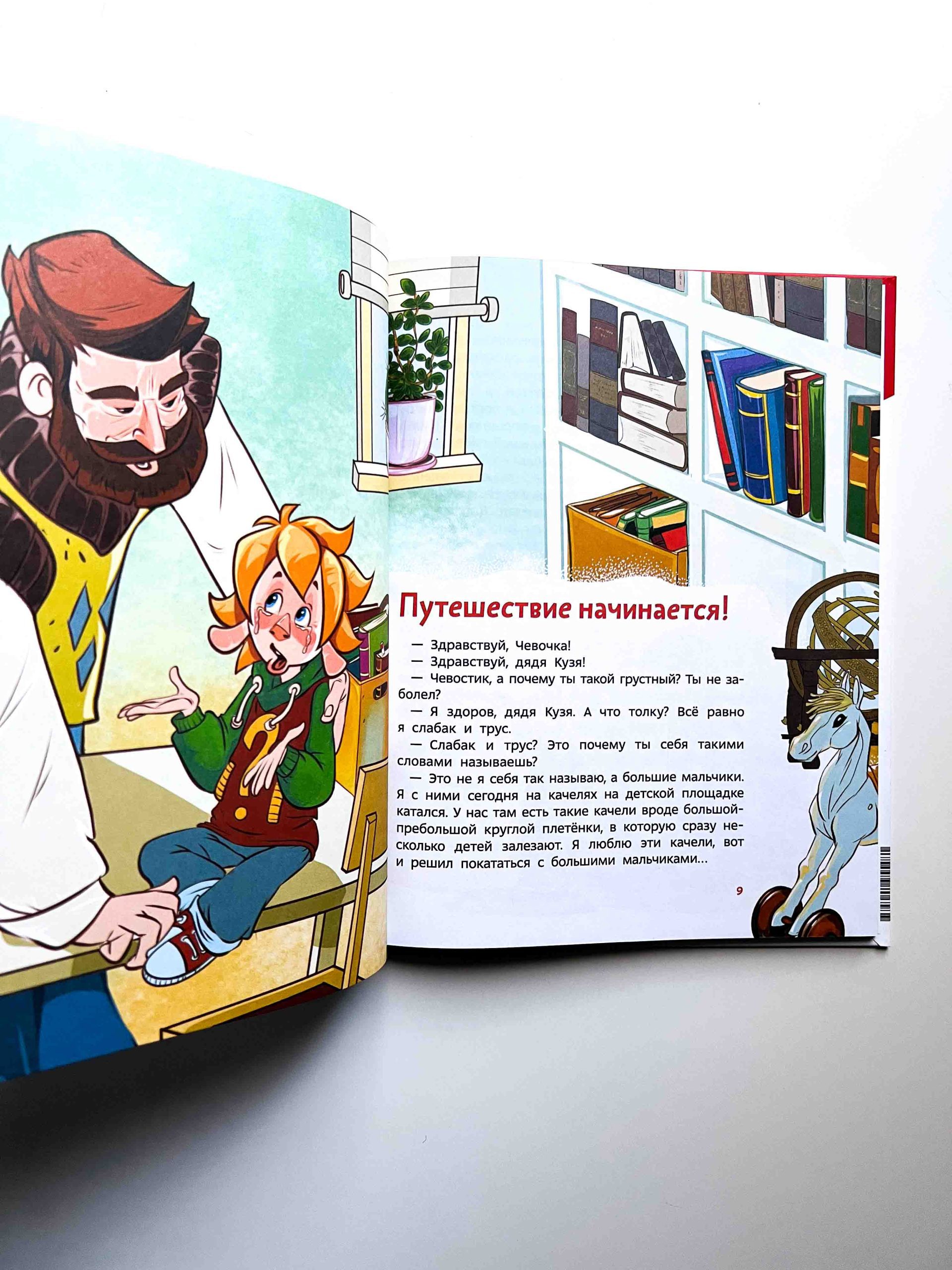 Чевостик вместе с дядей Кузей совершает удивительные путешествия в мир наук: физики, химии, астрономии, анатомии, геологии и других. Он рассказывает детям о великих географических открытиях, покорении космоса и волшебных химических превращениях.