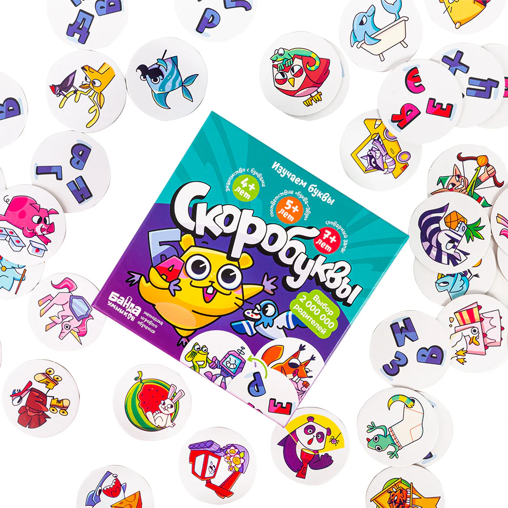 Игра познакомит с буквами и закрепит ассоциативное восприятие «буква-звук»: А — ананас, Б — бобёр. Увлекает с первого хода — хватать яркие фишки любят и дети, и взрослые! А яркие сюжеты расширяют словарный запас и тренируют воображение.