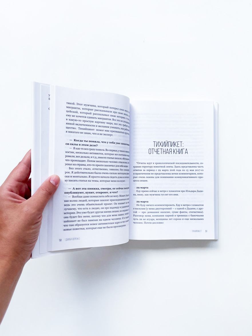 Акция #тихийпикет – это художественный и активистский проект, превратившийся в настоящее движение и объединивший многих людей не только в 50 городах России, но и в 30 странах по всему миру. #тихийпикет – это история о том, как незнакомые люди разных (а зачастую и противоположных) взглядов оказываются способны доброжелательно разговаривать друг с другом на улицах города, как формулируют вместе современное политическое, спорят и открыто обсуждают социальные проблемы и стереотипы. #тихийпикет – это двухлетняя ежедневная попытка диалога, это 3500 плакатов на самые разные темы – от ксенофобии (а также сексизма, гомофобии, расизма и т.д.) до современного искусства, это несколько тысяч сделанных активистками и активистами “отчётов” об этих важных и острых разговорах.