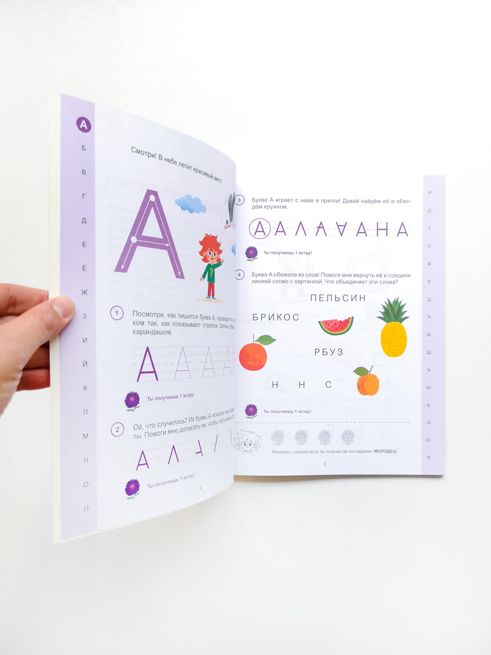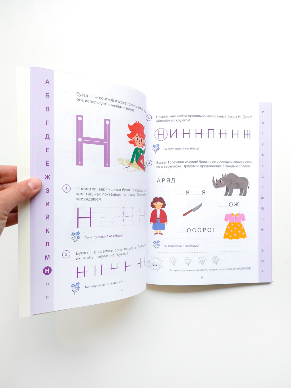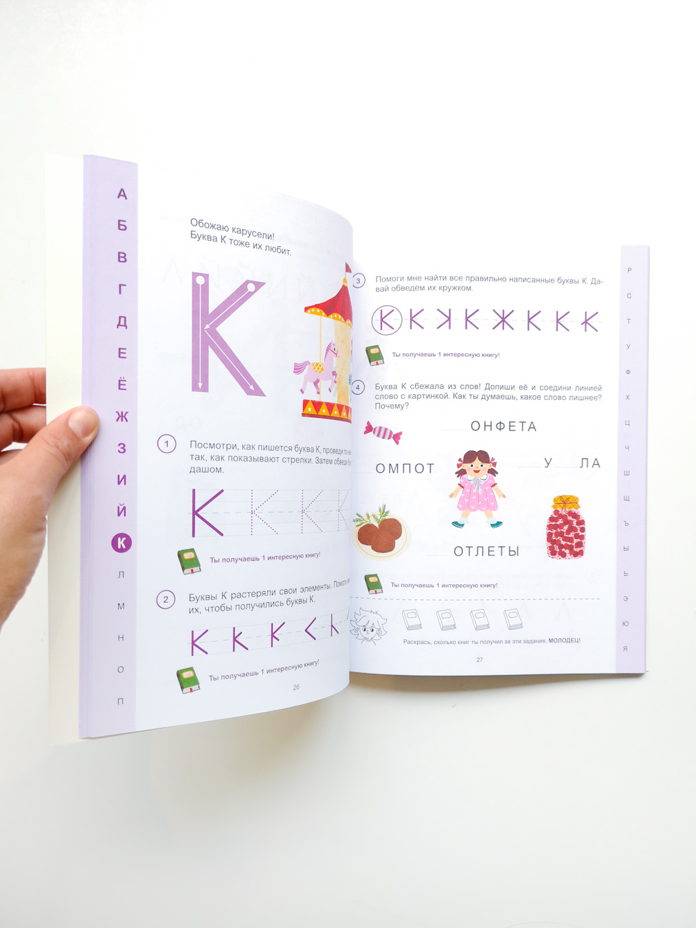 Каждой букве посвящено несколько разноплановых заданий, которые постепенно усложняются. Сначала ребенку предлагается обвести букву пальчиком, затем карандашом, после этого дописать недостающие элементы букв, и только в конце вписать букву в слово самостоятельно. Кроме того, есть задание на запоминание графического образа буквы.