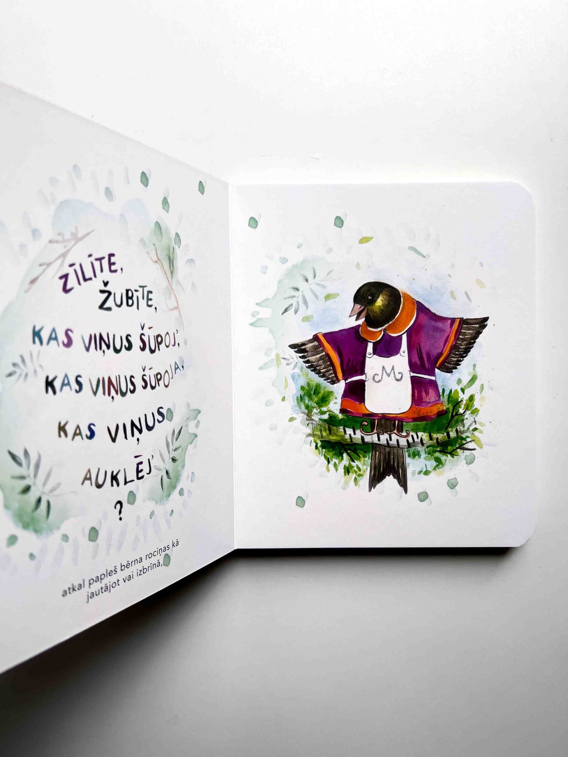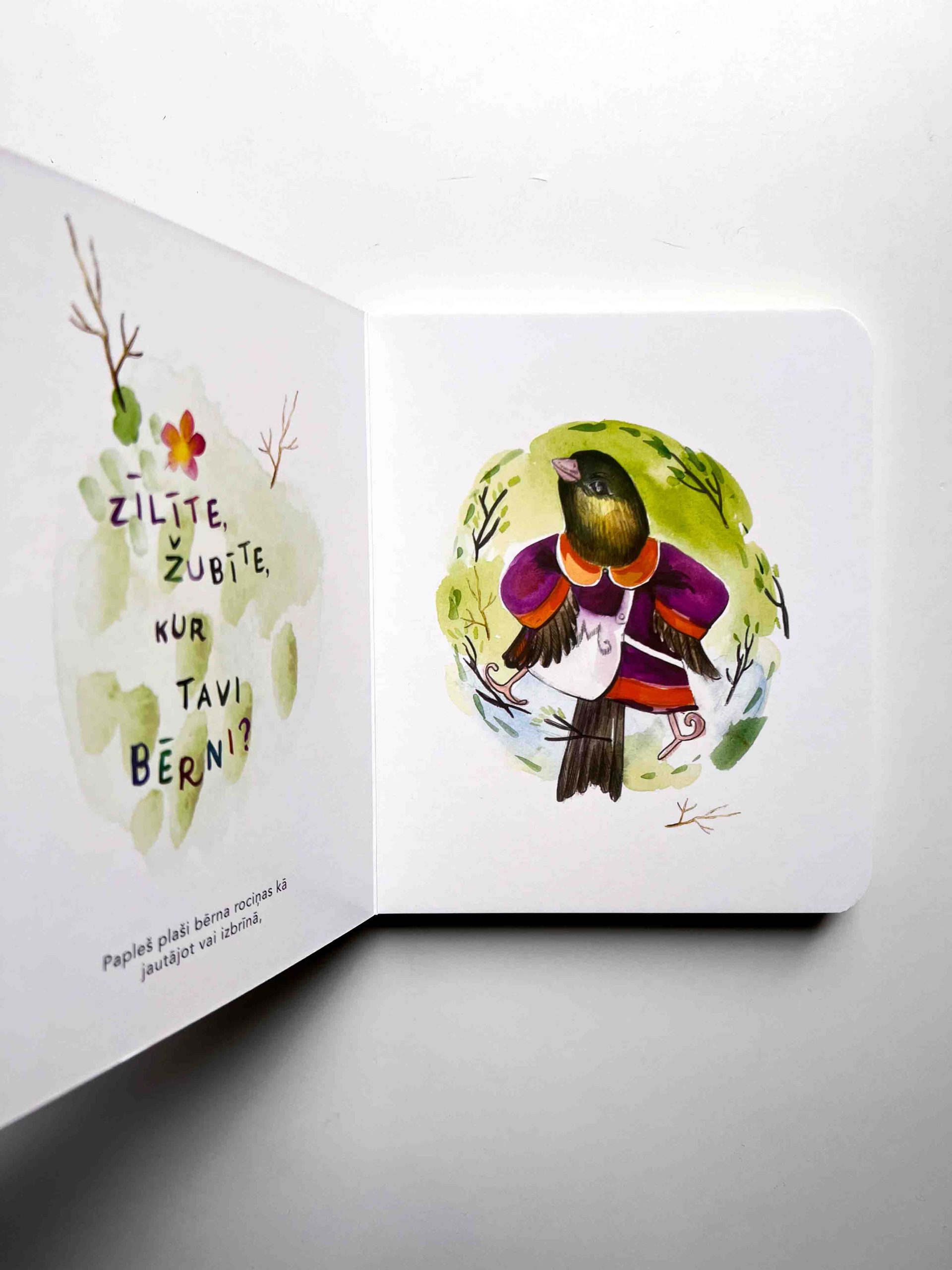 Paredzēta maziem bērniem, kuri jau sēž klēpī vecākiem.
